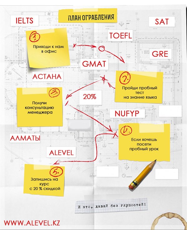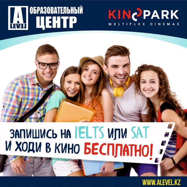 Дорогие друзья! Сегодня пятница и это значит что у нас акция! Мы вновь запускаем акцию «Запишись на IELTS или SAT и ходи в кино бесплатно!» Условия: Запишись и получай каждую неделю билеты в кино! Записаться на занятия по акции можно до 19.08.2016 г. Подробнее о акции по номеру: Мы находимся по адресу: г. Астана, Кабанбай батыра 7/2 (за торговым центром «MEGA»