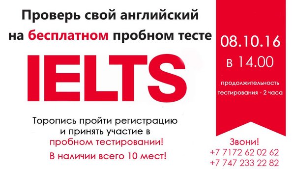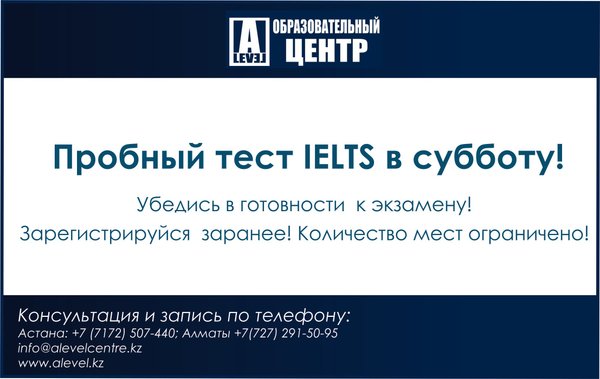 т позволит всем желающим поучаствовать в пробном тестировании к экзамену IELTS понять, что же это такое, и оценить свои возможности. — При тестировании будут использоваться все четыре аспекта: аудирование, письмо, чтение и разговорная речь. При посещении нашего образовательного центра, каждому тестируемому будет рассказано о его ошибках, а также даны рекомендации по дальнейшей работе над ошибками и акцентировании внимания над теми или иными темами при изучении английского языка. Стоимость: Для Астаны — Бесплатно. Для Алматы — 1000 тенге.