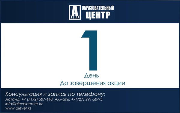 Добрый вечер, друзья! До окончания акции «20% скидки на все курсы в образовательном центре A-level»» остался 1 день! Астана: Адрес: Кабанбай батыра 7/2(за торговым центром «MEGA») Алматы:, 291-50-98 Адрес: пр. Абая 27 (уг. ул. Кунаева)
