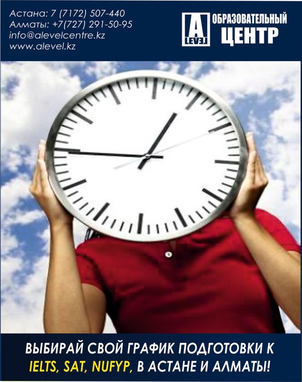 Набор в группы! Начало занятий в сентябре! Такого еще не было! Скидка 20% на все! При оплате курсов до 25 августа (включительно). General English; Бизнес английский; Подготовка к IELTS, SAT, SET, NUFYP; Корпоративный английский. В образовательном центре A-level: квалифицированные специалисты «добрые» цены 100% качество предоставляемых услуг УСЛОВИЯ. Купи сейчас и ходи в любое время до конца 2016 года. Записаться на бесплатное пробное занятие можно позвонив по телефону: Астана:, Алматы: или написав на info@alevelcentre.kz