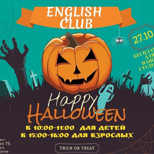 Knock Knock, Trick or treat?) Дорогие наши студенты и все желающие, ЗАВТРА 27.10 в нашем центре по адресу: проспект Абая 75, уг ул Масанчи, будет проходить ENGLISH CLUB С НОСИТЕЛЕМ на тему HALLOWEEN ⏰в 10:00—11:00 для детей. Будет угощение и веселье ⏰в 15:00—16:00 для взрослых, welcome . Для наших студентов совершенно БЕСПЛАТНО А для тех, кто у нас не обучается, стоимость разового посещения 1000 тг, а кто хочет участвовать в English club каждую субботу- абонемент 2500 тг за месяц . Приходите, ждём всех! Дополнительная информация п… — Читать дальше