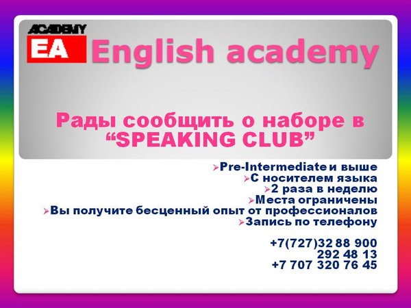 Для наших студентов совершенно БЕСПЛАТНО А для тех, кто у нас не обучается, стоимость разового посещения 1000 тг, а кто хочет участвовать в English club каждую субботу- абонемент 2500 тг за месяц