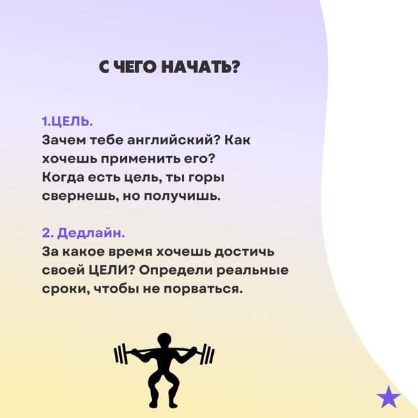 ийском свободно как на родном языке. В конце 9 класса я начала учить английский язык, были только базовые знания, с уровня Elementary. Было интересно и я регулярно занималась. Результат – за 1 год изучила все 6 уровней английского языка. Сейчас не про меня, расскажу в следующих постах) Листай ленту⏩⏩ Пиши свою цель по английскому в комментах. Первой желание, что приходит в голову, обычно истинное.