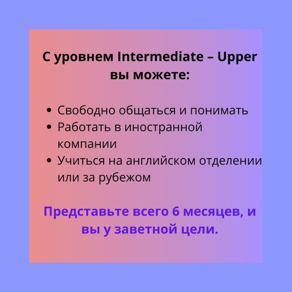 ОТКРЫТ НАБОР В НОВУЮ ГРУППУ PRE-INTERMEDIATE Базовую грамматику и времена ты знаешь. Словарный запас 1300 слов. Можешь поддержать короткий диалог. НО НЕ ХОЧЕШЬ НА ЭТОМ ОГРАНИЧИВАТЬСЯ? Тогда смело присоединяйся к новой группе Pre-Intermediate и продолжи с нами свой путь к совершенному владению языка! Оставляй свои контактные данные в дайректе или по этому номеру Whatsapp)