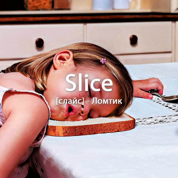 Slice — Ломтик Думаю вам не составит труда придумать предложение с этим словом и написать его в комментарий