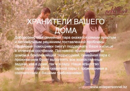 Мы являемся профессионалами в области подбора домашнего персонала! Наши клиенты ценят нас и нашу работу, наши сотрудники готовы решить любую задачу, поставленную перед ними. Мы экономим Ваше время, предоставляя лучших из лучших! Мы находимся по адресу : Панфилова 110, уг. улицы Богенбай батыра, блок 2, офис 201. Пусть этот день дарит Вам только положительные эмоции и интересные встречи! Хорошего дня! Приходите, мы Вас ждем!
