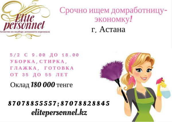 Агентство » Elite personnel» ищет домработницу-экономку. г. АСТАНА График работы: 5/2 с 9.00 до 18.00. 250 кв.м. квартира чистая Обязанности: уборка, глажка, стирка + готовка. Возраст от 35 до 55 лет. Оклад 180 000 тенге.