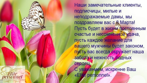 Весна пришла, и мир ожил, Цветными красками играя. Для грусти больше нет причин, Мы с 1 марта поздравляем! Пусть принесет Вам всем весна Улыбки, счастье, вдохновенье, Избавит от печали вмиг, Пускай подарит настроенье! Искренне Ваш @elite_peronnel_home!