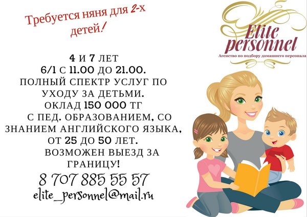 Приглашаем добрых, активных нянь заполнит анкету в нашем агентстве. Если Вы любите детей, Вам от 25 до 48 лет. Опыт работы от 3-х лет. Мы ждем именно Вас!