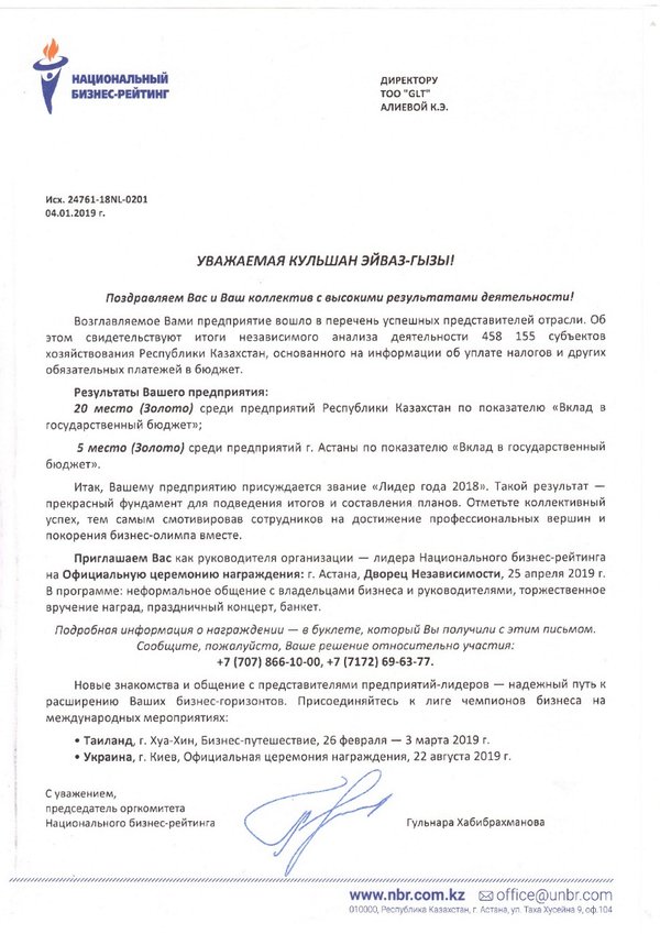 Переводческая компания Gala Translations делится прекрасной новостью со своими подписчиками! Мы получили поздравление с высокими результатами деятельности от компании Национальный бизнес-рейтинг! _____________ «GALA TRANSLATIONS» Астана: БЦ Астаналык, ул.Кунаева 33, 3 этаж 302 офис, Алматы: ул.Абая угол Ауэзова 68/74, БЦ Forte Leasing Bld.,офис 347 , Актау: 2 мкр., зд.47 Б, БЦ Сункар, офис113, Атырау: пр. Азаттык 8, БЦ Мирас, офис 16, , galatranslations@yahoo.com galatranslations.com.kz