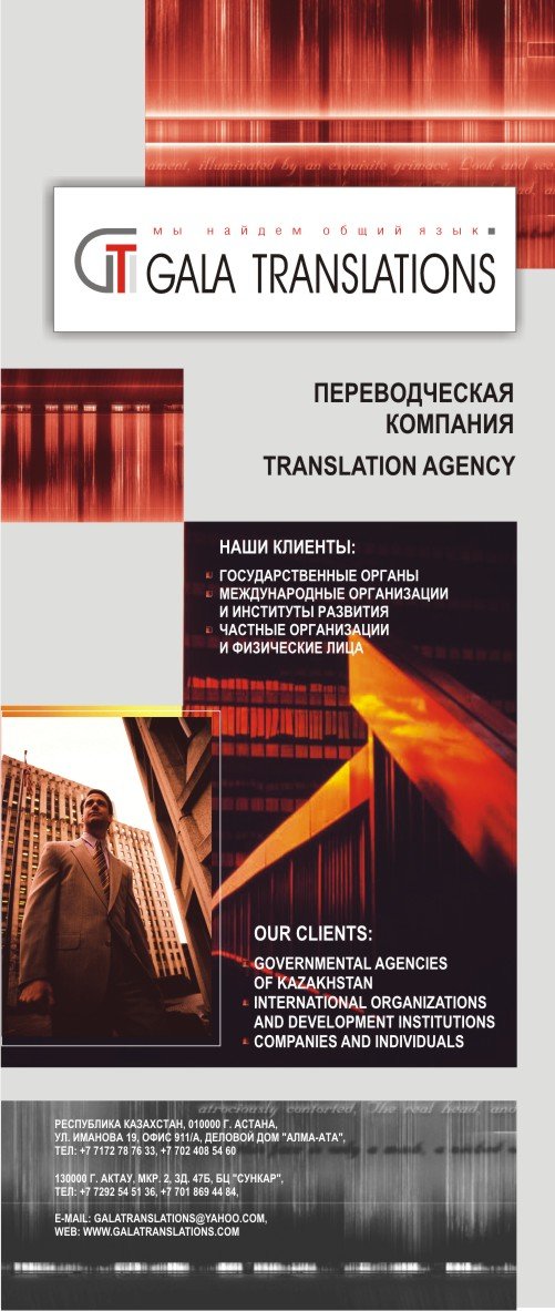 еревод, перевод юридических документов. У нас Вы получите услуги БЫСТРО и КАЧЕСТВЕННО! Gala Translations всегда рады новым знакомствам и новым друзьям!!! _____________ «GALA TRANSLATIONS» Астана: БЦ Астаналык, ул.Кунаева 33, 3 этаж 302 офис, Алматы: ул.Абая угол Ауэзова 68/74, БЦ Forte Leasing Bld.,офис 347 , Актау: 2 мкр., зд.47 Б, БЦ Сункар, офис113, Атырау: пр. Азаттык 8, БЦ Мирас, офис 16, , galatranslations@yahoo.com galatranslations.com.kz