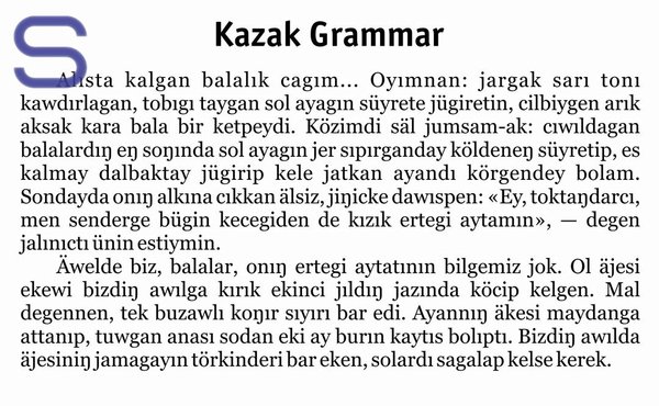 Kazak Grammar қазақ тілі (11.09.2017): SÖZEKTİ Письменность должна не просто графически отображать язык, но и представлять всё ее своебразие в наиболее выгодном свете посредством этой письменности. Те языки с латинской графикой, в которых ученые смогли найти баланс между продуманным и системным отражением фонем языка, этимологически верной передачей слов и избегания чрезмерной визуальной нагроможденности языка выглядят эстетично. Такие языки привлекают к себе внимание огромного количества лингвистов и лингволюбителей по всей планете. Специфичес… — Читать дальше