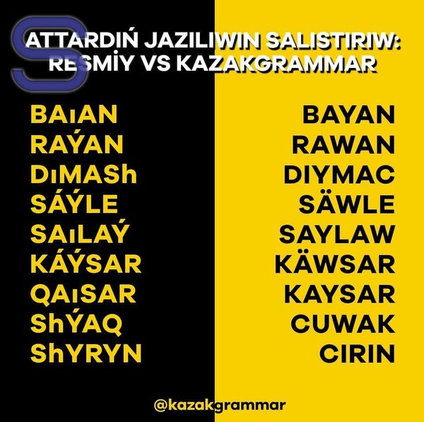 Адам аттарының жазылуын салыстыру. Ресми мен Kazakgrammar нұсқалары.