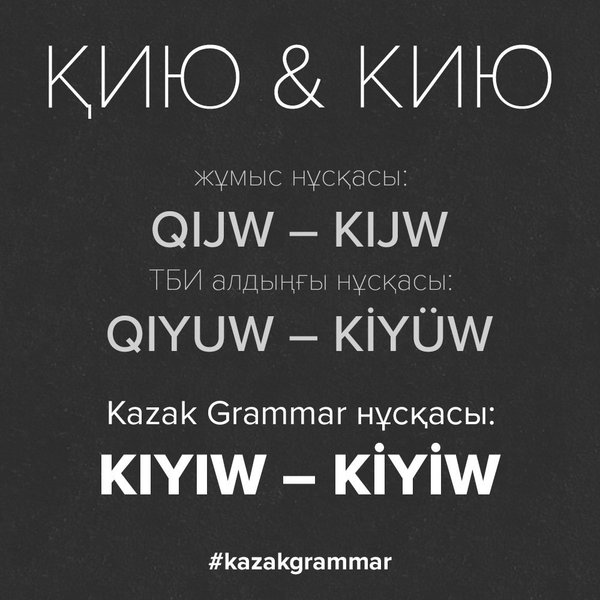 кие черты этих языков всегда приводятся в примеры в лингвистической литературе и лингвобеседах. Вывыренность диграфов/триграфов либо диакритических букв в латиницах типа испанского или шведского делают их особо привлекательными, нагромажденность же польской, чешской, вьетнамской или албанской латиниц вызывают только отталкивающий эффект. Мы ведь не хотим, чтобы қазақ тілі воспринимался непонятным тюркским языком с еще более непонятным неэстетичным алфавитом? Рассмотрим одну из изысканнейших черт қазақ тілі — реализацию аллофонов Қ и К в зависимости от рядом стоящих гласных на примере пары ҚИЮ & КИЮ. Рабочая версия KZ латиницы предлагает записывать слова ҚИЮ и КИЮ как QIJW (где qi- это прямая транслитерация қи- с кириллицы, а -jw обозначает -ю) и KIJW (ki + jw). Как видим, рабочий проект латиницы для қазақ тілі это полная копия нынешней кириллицы с ее псевдодифтонгами У (= ұу, ыу, іу) и И (= ый, ій). «Принятие нового письма отнюдь не означает смену одних знаков другими. Это исправление недочетов, касающихся правописания, допущенных в предыдущих вариантах алфавита. В этой связи, на наш взгляд, с созданием алфавита и его внедрением также необходимо принятие новых правил орфографии», — отметил Директор Республиканского координационно-методического центра развития языков имени Шаяхметова Ербол Тлешов в ходе парламентских слушаний. Понятно, но где исправление недочетов если предлагается как и прежде писать слово «жазу» как zhazw? Тут W дает сочетание Ы + У, но обозначается одной согласной буквой, что идет вразрез с рядом правил казакского языка, согласно котором W не может идти после согласных и слова не могут заканчиваться сочетанием -ZW. Многим неизвестно, что из-за нынешних псевдодифтонгов У и И многие слова грамматически неправильно делятся по слогам. Например слова «жануар», «сиыр», «аюы» и «шие» не могут быть правильно поделены на слоги, ибо получаются: Жа-Ну-Ар, Си-Ыр, А-Ю-Ы, Ши-Е, а слоги в қазақ тілі могут начинаться на гласный звук только в первом слоге, в последующие же слоги должны всегда начинаться на согласную. Правильно было бы делить как: Жа-Ны-Уар, Сы-Йыр, А-Йы-Уы, Ші-Йе. В рабочей версии латиницы, судя по надписи «zhazw» в презентации для сегодняшнего Слушания, эти ошибки никуда не ушли. Так где исправление недочетов, г-н Тлешов? Есть вероятность того, что слова ҚИЮ и КИЮ после обещанной Ерболом Тлешовым реформы орфорафии будут писаться как QYJW и KIJW (kij + w вместо ki + jw), что тоже никоим образом не решает проблему. Стоит упомянуть, что сказал Директор Института языкознания имени Байтурсынова Ерден Кажыбек по поводу рабочего варианта: Мы единогласно поддержали эту версию, поэтому прошу вас принимать эту версию как консолидированное мнение всех казахстанских ученых, имеющих отношение к этому вопросу. В другом варианте латиницы института языкознания им. Байтурсынова ҚИЮ и КИЮ писались бы как Qıyuw и Kiyüw. Тут уже не соблюдено фундаментальное правило казакского языка и общая прогрессивная черта всех тюркских языков — делабиализация: губные гласные (Ұ,Ү, О, Ө) не могут идти дальше первого слога. Подытожим три варианта написания ҚИЮ & КИЮ: На рабочем варианте: Qijw & Kijw (или Qyjw & Kijw) На варианте с диакритикой института языкознания им. Байтурсынова — Qıyuw & Kiyüw На варианте Kazak Grammar: Kıyıw & Kiyiw.