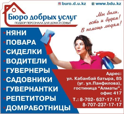 Адрес агентства по подбору персонала Бюро Добрых Услуг: Казахстан, Алматы, Кабанбай батыра, 85.