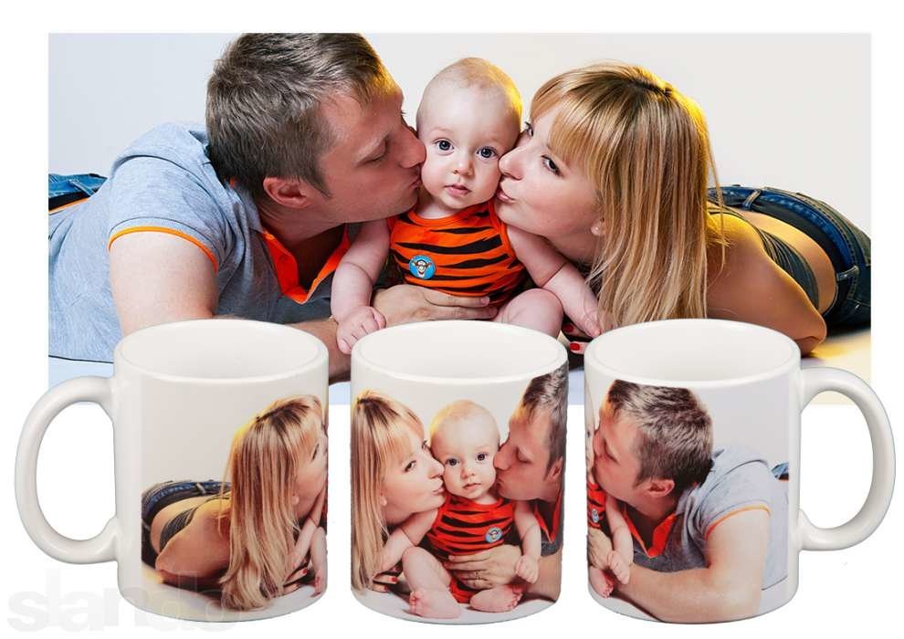 Фото на кружках, тарелках, значках, магнитах.