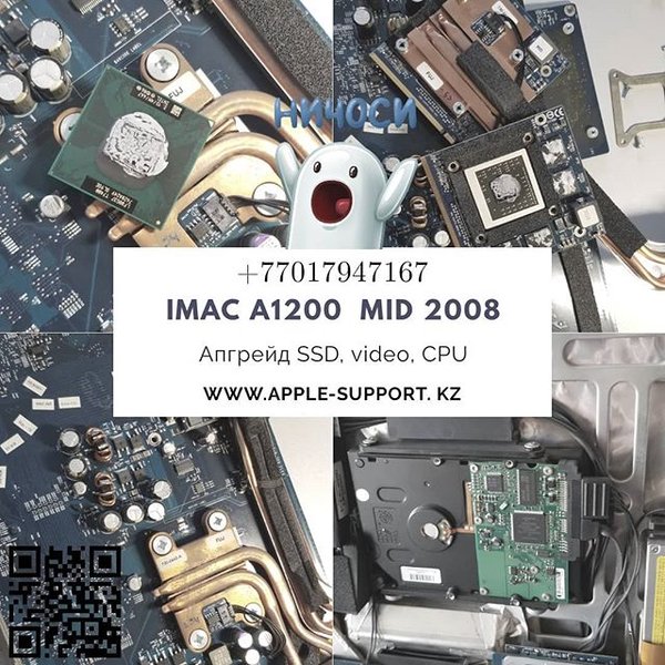 Alex Белых (12.10.2018): IMAC A1200 была произведена замена видеокарты с geforce 7300 на 7600GT. Замена процессора с 2.16, на 2.6, Оперативная память с 1 GB на 4 и установка Apple SSD НА 128 GB. МОНОБЛОК снова становится актуальным. Всё услуги производится у нас ️apple-support.kz ️Help-apple.kz ️ ️ what's app) Ремонт Apple iPhone, iPad, iMaс, MacBook, Apple Watch Выезд мастера \ Режим работы: с 10:00 до 19:00 (но предварительно позвоните) ️ apple-support.kz и i-apple.kz