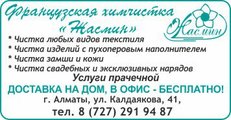 Химчистка-прачечная «Жасмин» осуществляет чистки, стирку, глажку и ремонт одежды. Производится стирка сорочек, униформы и постельного белья, сухая чистка замши, кожи и изделий из меха, химическая чистка дубленок, замши, ковров, подушек, игрушек, автомобильных чехлов, штор и постельного белья. По необходимости производится подкрашивание кожи и дубленок. Для срочных заказов предоставляется экспресс-стирка. Имеется мастерская ремонта одежды. Также компания ведет сотрудничество с юридическими лицами. Возможен вывоз и доставка на дом.