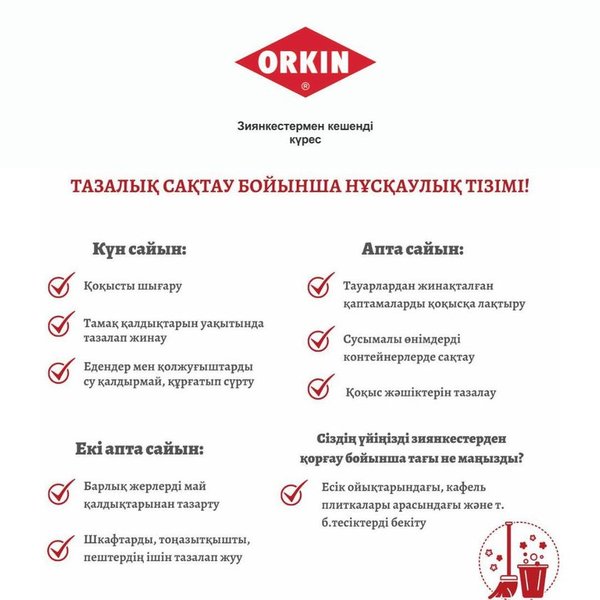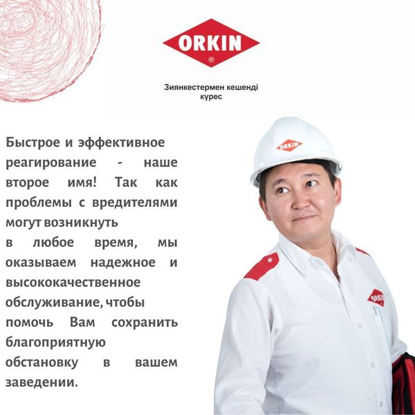 ORKIN – бұл ғылымға негізделген зиянкестерге қарсы кешенді күрес. 121 жылдан аса уақытты қамтыған тәжірибе. Ең сенімді кепілдік! Call-орталығы 24/7: Нұр-Сұлтан:, Алматы: Ақтөбе: Ақтау: Атырау: Шымкент: Өскемен:, Павлодар: Петропавл:, Көкшетау: Қостанай: Семей: Қарағанды: Немесе бізге хат жазыңыз info@orkin.kz