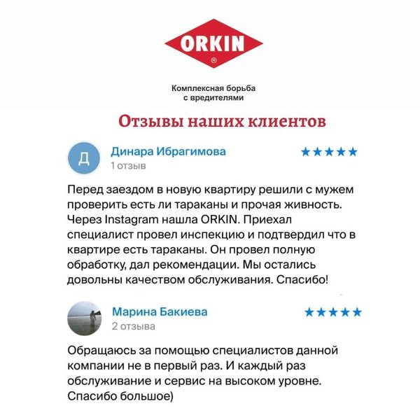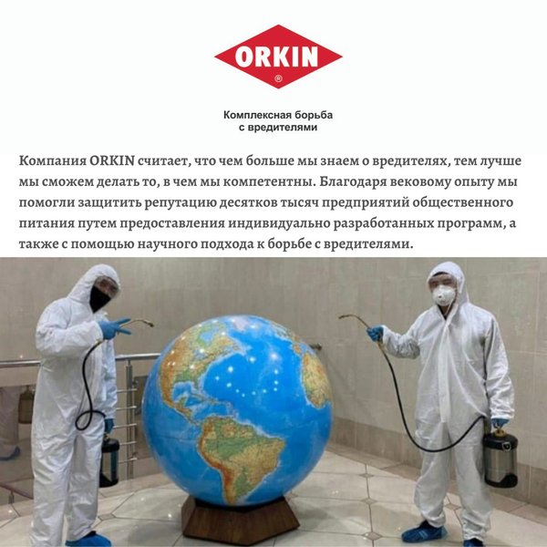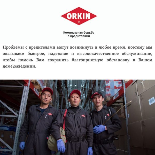 . Также команда ORKIN сообщает Вам, что данная страница – официальная страница компании. Приносим свои извинения, если не могли найти нас на медиа пространстве, мы проходили долгую модерацию Fаcebook. Теперь мы готовы снова радовать Вас своими достижениями! Принимаем Ваши заявки 24/7. С уважением, Команда ORKIN. Закажите бесплатную инспекцию по телефонам, указанным ниже: ORKIN — это комплексная борьба с насекомыми и грызунами, основанная на науке. 121 год мирового опыта. Самая исчерпывающая гарантия Call-центр 24/7: Нур-Султан:, Алматы: Актобе: Атырау: Актау: Шымкент: Усть-Каменогорск:, Павлодар: Петропавловск:, Костанай: Кокшетау: Караганда: Семей: Или пишите нам на info@orkin.kz