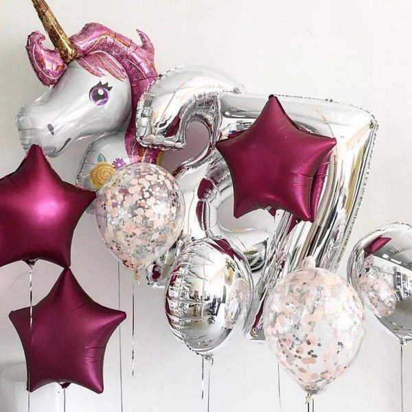 Сверкающий серебром сет с единорогом шар единорог + 2 цифры на выбор+ 3 звезды + 2 фольгированных шара + 2 шара с конфетти Стоимость всей композиции = 3200 рублей Цветовая гамма, как всегда на ваш выбор Шаровёнок.рф оформит ваш праздник в любом стиле. Для заказа WhatsApp в шапке профиля, direct, SMS, ️
