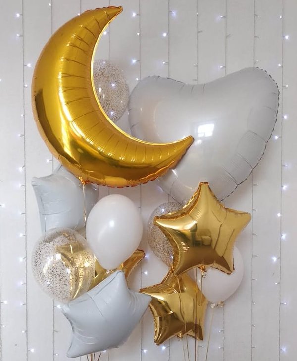 Шикарный сет «луна» из 2 фонтанов подходит на любой праздник как на встречу из роддома, так и на празднование юбилея или даже на день свадьбы.