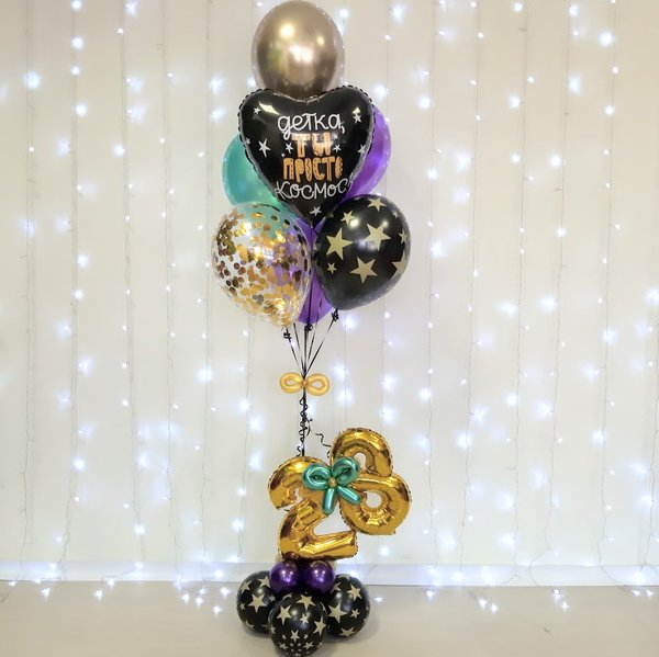 Космический букет 1330 рублей. Состоит из 4 шаров без рисунка, 1 шара с конфетти, 1 шара с рисунком, 1 фольгированного шара с надписью и фантазийного основания с двумя цифрами- мини. Цветовая гамма разнообразна и зависит только от вашей фантазии. Для заказа WhatsApp в шапке профиля, direct, SMS, ️