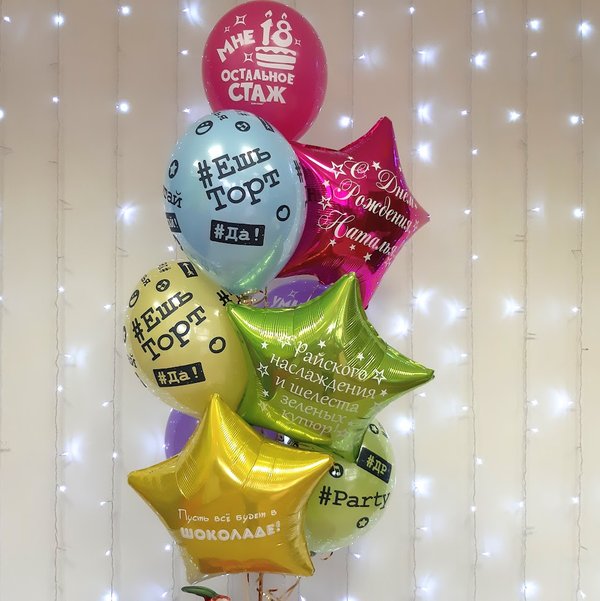 Композиция состоит из фонтана шаров, двух фольгированных цифр и фантазийного дизайнерского основания = 2590 рублей Фонтан из 8 шаров без рисунка и 1 фольгированной звезды Основание — 1 фольгированная звезда, фольгированные и латексные шарики разных форм и размеров. Цветовая гамма зависит только от вашей фантазии. Для заказа WhatsApp в шапке профиля, direct, SMS, ️