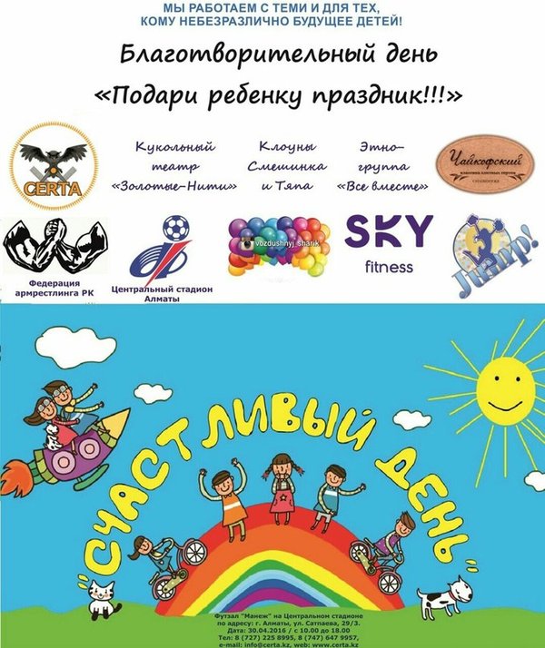 тских домов. Кол-во входных билетов ограничено (50 шт.), также есть возможность приобретения благотворительных купонов без присутствия на мероприятии (количество не ограничено). В программе мероприятия: • показательные выступления Федерации армрестлинга Казахстана; • спортивные номера детских черлидеров Алматы; • танцевальные номера спортивных клубов Алматы; • спортивные соревнования среди детей; • ярмарка народных ремесел с представлением мастер-классов; • детский кукольный театр; • благотворительный концерт с участием музыкальных групп; • выставка-продажа детских художественных работ. Благотворительный день не имеет возрастных ограничений. Цена входного билета – 10 000тг. Цена благотворительного билета – 5 000 тг. Адрес: г. Алматы, ул. Сатпаева 29/3, Футзал «Манеж» на Центральном стадионе Подробности по телефону:,