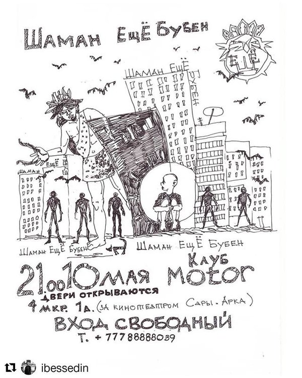 Владимир Гараж (06.05.2019): #Repost ibessedin (get_repost) ・・・ Выступление группы Shaman Ещё Бубен в клубе motor_club_almaty 10 мая с новой программой Алма-Ата, 4-й микрорайон, 1А (за кинотеатром Сары-Арка) Телефон для справок: Вход совободный