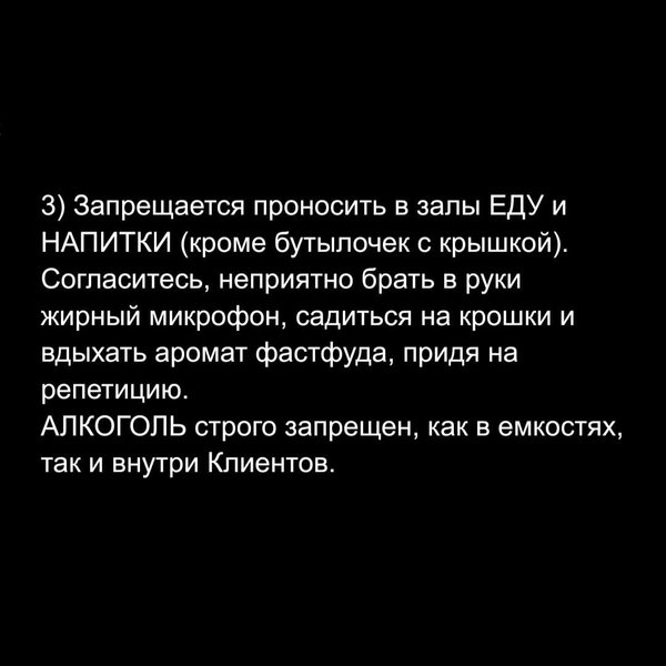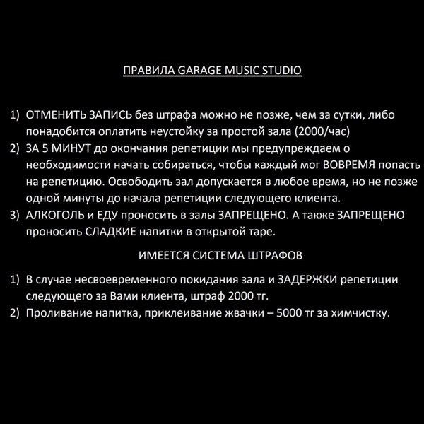 Владимир Гараж (02.09.2021): Дорогие друзья! В связи с заметно возросшими ценами на барабанные тарелки, стоимость аренды железа с 6 сентября будет 400 тг за репетицию.