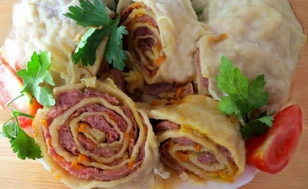 В мясной фарш добавляем специи, соль, яйцо, потереть небольшую картофелину. Тонко раскатываем тесто, выкладываем мясной фарш, на него овощной.