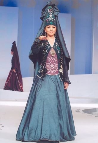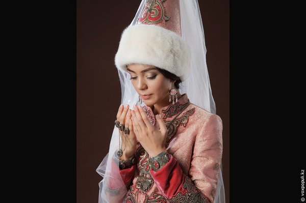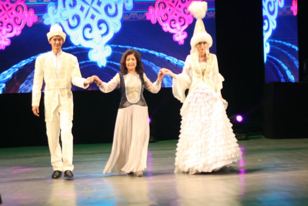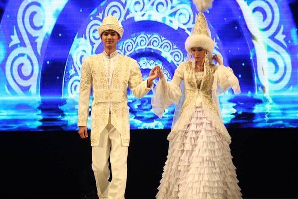 Актриса Айсұлу Азимбаева — «Ерке-Нұр» сән театрының «Ақ босаға» коллекциясының костюмымен.