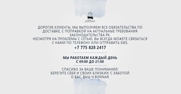 Дорогие клиенты, мы выполняем все обязательства по доставке, с поправкой на актуальные требования законодательства РК. Несмотря на проблемы с сетью, Вы всегда можете связаться с нами по телефону +7 (775) — 828 — 24 – 17 или отправить SMS. Наши фирменные салоны работают по следующему графику: Нур-Султан: 10:00—21:00 Алматы: 09:00 – 21:00 Шымкент: 09:00 – 19:00 Актобе: 09:00 – 20:00 Подробнее о графике работы в других регионах Вы можете узнать по указанным контактам. Спасибо за Ваше понимание! Берегите себя и своих близких! С заботой о Вас, ваш H… — Читать дальше