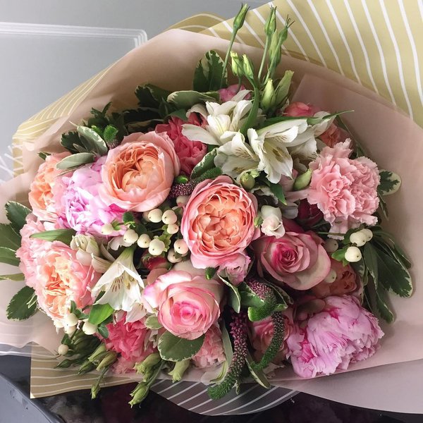 , белые и многие другие. Букеты из пионовидных розы можно приобрести на gulder.kz. Букет «Розовое одеяло«- 26000 тг