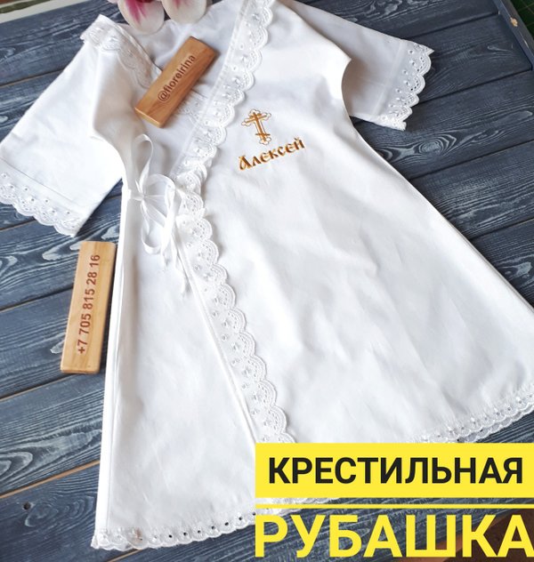 Крестильная рубашка для важного дня вашего малыша.. Хлопок 100% Именная рубашка 8500 тг 1—2 дня на производство . Когда она одевается? Рубашку одевают уже после того как ребенка окунули в купель. Из купели малыша принимает крестная в крыжму или полотенце, и потом можно надеть рубашку. Ее так же хранят вместе с крыжмой, и в быту не используют. . Крой специально сделан так, чтобы было удобно одевать, как халат, а не через голову. По собственному опыту могу сказать, что такой крой самый оптимальный. Время на переодевание ооочень мало, все про… — Читать дальше