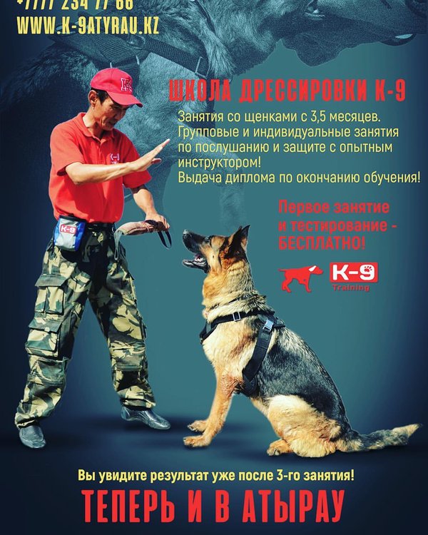 Alexander Bodnar (18.07.2017): Не за горами 1 сентября-поспешите записать своего четвероного питомца в 1 класс #школадрессировкик9 в #k9atyrau! Только у нас отработанные годами программы подготовки щенков от «азов» до сдачи квалификационных экзаменов! Более 800 владельцев собак в нашей Республике доверили нам своих собак за 10 лет работы! Приходите на занятия-и убедитесь сами — результат будет виден уже после 3 занятия! lapazoomagazin @ Atyrau