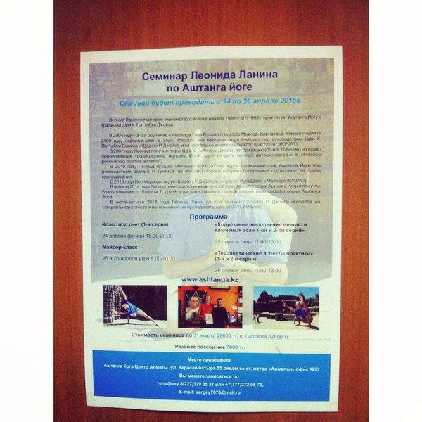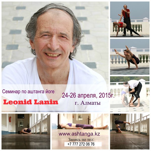 Аштанга Йога Центр Алматы (01.04.2015): Друзья, сообщаем, что до семинара Леонида Ланина — преподавателя Аштанга йоги из Москвы осталось совсем немного. Мы ожидаем его 24, 25 и 26 апреля. Программа семинара будет включать лэд-класс, два майсор-класса и две лекции по корректному освоению асан 1 и 2 серии, и о терапевтических аспектах практики. Стоимость семинара — 32 000 тг. Разовое посещение -7 000 тг. Подробная информация здесь: Запись по телефонам:, Сергей), Нигара)