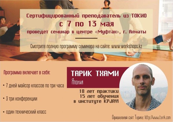 Аштанга Йога Центр Алматы (13.04.2015): Вслед за Леонидом Ланиным, который проведет семинар у нас в центре, Алматы посетит преподаватель Аштанга йоги из Японии — Тарик Тхами. Наши друзья в лице Санди Рахимбаевой организовывают его семинар с 7 по 13 мая. У Тарика богатый опыт практики и преподавания. С программой Вы можете ознакомиться на сайте наших партнеров. Желаем Вам грамотно распределить свои силы и время, чтобы попасть на оба семинара :)