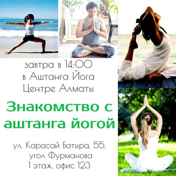 Сегодня последний день акции для начинающих, сегодня вы все еще можете воспользоваться случаем и получить скидку, приобрести абонемент и заниматься весь август за 10 000 вместо 18 000. Наш сайт: ashtanga.kz Здесь вы можете ознакомиться с расписанием и видами классов. Справки по тел., Сергей) Аштанга Йога Центр Алматы находится по адресу ул. Карасай Батыра 55 офис 123, 1 этаж (угол ул. Фурманова).