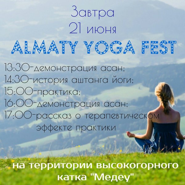 Аштанга Йога Центр Алматы (26.08.2016): Наверное, вы помните, как в апреле мы выезжали на Медео и дышали, дышали, дышали свежим воздухом, проветривали наши ужас как замученные различными выхлопами легкие. Надеемся, вам было хорошо, и хотим, чтобы было ещё лучше.))) Поэтому предлагаем повторить и присоединиться к нам на цикл коротких пранаям, который будет проводить Сергей Вертков в следующее воскресенье, 4 сентября. Какие будут предложения по месту проведения? Пишите.