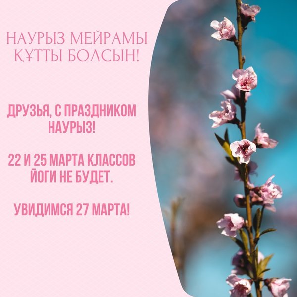 ЙОГИЧЕСКИЕ КАНИКУЛЫ ДО 27 МАРТА ⠀ Друзья, поздравляю вас с праздником Наурыз Мейрамы! Пусть взаимопонимание, согласие, крепкое здоровье, любовь и процветание будут постоянными обитателями вашего дома! ⠀ 22 и 25 марта йогических классов не будет, мы возобновим практику в четверг, 27 марта ⠀ До скорой встречи! ⠀