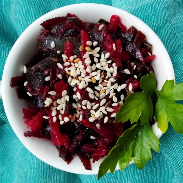 вкусу 3 ст л ароматного масла (подсолнечного, кунжутного, горчичного. Что любите или что есть) Готовим: Капусту заливаем на ночь кипятком, утром хорошо промываем и мелко режем. Свеклу и морковь варим до готовности, остужаем и натираем на крупной тёрке. В глубокой миске смешиваем остальные ингредиенты (это будет заправка или маринад). Кладём туда же капусту, морковь и свеклу и хорошенько всё перемешиваем. Переклвадываем в стеклянную банку и ставим в холодильник на сутки (если хватит терпения, в принципе можно пробовать уже через пару часов). Вот и всё. Получается очень вкусно и сочно. С нетерпением ждём ваших отзывов