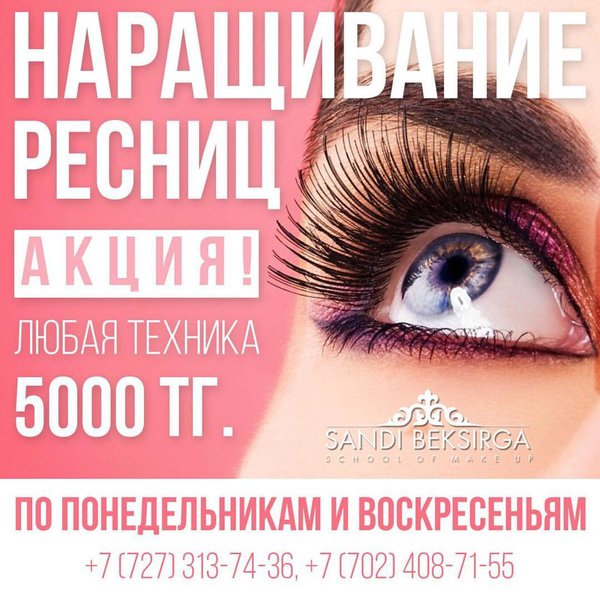!!!HAPPY HOURS!!! Алматы!!! Милые наши девушки, дамы!!! Студия красоты Sandi Beksirga снова радует вас горячими акциями!!! Качественное НАРАЩИВАНИЕ РЕСНИЦ по самым вкусным ценам!!! Не упустите!!! Только понедельникам и воскресеньям: Любая техника: классическое, 2D, 3D — всё за: ____________________5000 тг_________________________ Будьте неотразимы вместе с нами!!! Обязательна предварительная запись по тел: 8 (727) 313 74 36 8 702 408 71 55 Адрес: г.Алматы, ул Муканова, уг. ул. Шевченко, ЖК Театральный, Блок 1, 19 этаж. @ Алматы