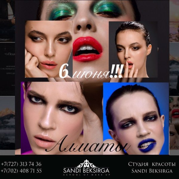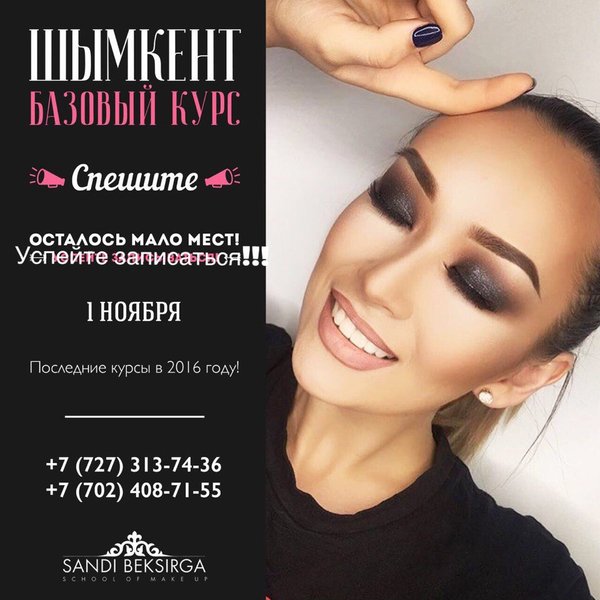 самосовершенствование, вы никогда не будете в проигрыше, так как ваши знания у вас никто не отнимет, они останутся у вас, куда бы вы не пошли! Главное, сделать правильный выбор!!! — — — — — — — — — — — — — — — — — — — — Начало обучения: 1 ноября Продолжительность: 5 дней по 6 часов (итого 30 часов) — — — — — — — — — — — — — — — — — — — — Программа включает в себя: все актуальные виды макияжей и фишки, так называемые «must-have» от Sandi Beksirga! Последние курсы в вашем городе в 2016 году Отработка на моделях обязательна Документ об окончании: сертификат Международного образца от Make-up studio. Места ограничены и запись осуществляется только по предоплате Справки по тел: 87024087155 87273137436 @sandi_beksirga_studio Sandi Beksirga