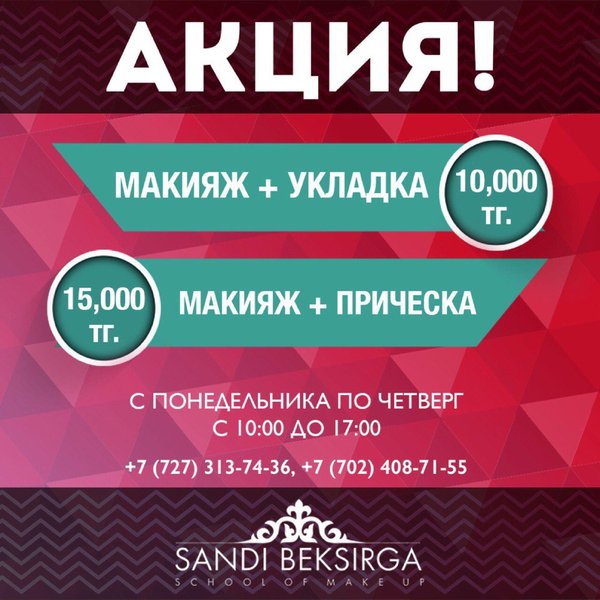 !!!HAPPY HOURS!!! Алматы!!! Милые наши девушки, дамы!!! В студии красоты Sandi Beksirga снова начались акции на макияж и причёски Не упустите счастливые часы: С понедельника по четверг С 10—00 до 17—00: Макияж + укладка — 10 000Тг Макияж + причёска — 15 000тг Будьте неотразимы вместе с нами!!! Обязательна предварительная запись по тел: 8 (727) 313 74 36 8 702 408 71 55 Адрес: г.Алматы, ул Муканова, уг. ул. Шевченко, ЖК Театральный, Блок 1, 19 этаж.