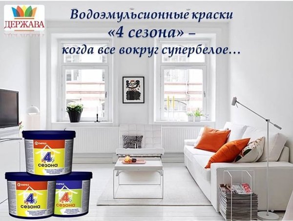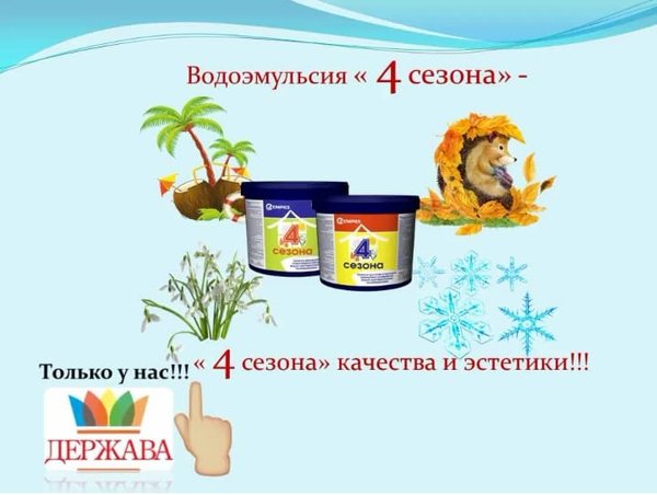 Водоэмульсия «4 сезона» Предназначена для окрашивания минеральных поверхностей (бетон, штукатурка, кирпич), деревянных поверхностей (включая ДВП, ДСП), на обоев и других пористых поверхностей. Расход: при нанесении в один слой 150 г/м². Время высыхания: 1/24 часа (между слоями/ полное высыхание). Цветовая гамма: белая, возможна колеровка универсальными колеровочными пастами и водно-дисперсионными колерами. Фасовка/кол-во шт в коробке: 1,5кг/6шт; 3кг/4шт; 6,5кг/2шт; 13кг; 25кг