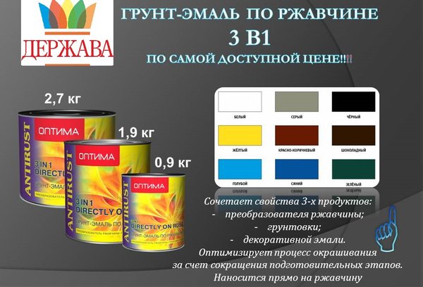 ржавчины). Грунт-эмали «Оптима» быстро сохнут (время высыхания каждого слоя — до 20часов), экономно расходуются (расход — до 200 г/кв. м при нанесении в 1 слой). Грунт-эмали надежно защищают металлоконструкции от коррозии и выполняют функции декоративного покрытия, а процесс окрашивания требует меньше времени и усилий за счет сокращения подготовительных этапов. Также грунт-эмали «Оптима» подходят для окрашивания деревянных и минеральных поверхностей. В настоящее время под маркой «Оптима» производятся глянцевые грунт-эмали белого, серого, черного, желтого, красно-коричневого, шоколадного, голубого, синего и зеленого цвета. Лакокрасочные материалы фасуются в жестяные банки по 0,9, 1,9 и 2,7 кг. Обращаться по адресам или по телефонам указанным ниже: г.Нур-Султан, ул. Брусиловского, 25. тел.:; г. Караганда, ул.Складская, 9/2, оф.1. тел.:,. г. Павлодар, ул. Ледовского, строение 35. Тел.:,. г.Алматы, ул.Новгородская 172/2, угол Сейфуллина, 4 этаж, оф 401. Тел.:.