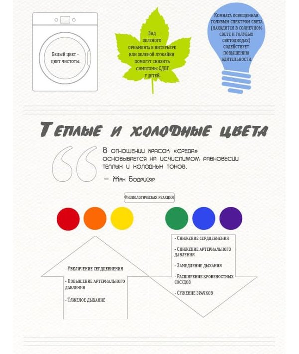 кто ищат любви, внимания и понимания. Этот цвет является очень нежным цветом и выбирать его следует для детских комнат девочек. Цвет психосостояния человека: мечтательный, нежный мягкий. Красный Красный положительно влияет на кровообращение, стимулирует сердечный ритм. Отрицательные составляющие? Красный цвет может увеличить гнев и ярость. Кто должен выбирать этот цвет? Вялые, уставшие люди, которые пытаются привлечь внимания к себе, добиться положительного результата, но ввиду своих личных качеств этого не получается. Таким людям рекомендуется использовать красный цвет в интерьере для восстановления внутренней энергии и вдохновения. Цвет психосостояния человека: неуравновешанный, психически неустоявшийся. Белый Если вам нужно справиться со стрессом, горем и перепадами настроения, тогда белый цвет создан для вас! Кажется, это такой нейтральный цвет, но у него также есть волшебные силы! Если вы решите покрасить стены вашей спальни в белый, то это наверняка повлияет на ваше настроение, обеспечивающее вам спокойствие и гармонию! Цвет психосостояния человека: Спокойный, уверенный, гармоничный. Оранжевый Этот энергичный цвет оказывает хорошее влияние на пищеварение. Хорошо его использовать на кухне. Он делает вас более энергичным. Он также помогает, когда вы хотите быстрее восстановиться, согреться. Когда вы страдаете от депрессии, низкой самооценки, чувствуете, что недополучили любовь, оранжевый — идеальный вариант! Он даст вам дополнительную мотивацию! Цвет психосостояния человека: энергичный Фиолетовый Фиолетовый оказывает положительное влияние на ваш мозг и нервную систему. Если вы на диете, то использование фиолетового на кухне просто идеально подходит для вас — он может даже уменьшить ваш аппетит! Если вы жалуетесь на бессонницу, тогда выбирайте этот волшебный цвет в спальне! Этот цвет вдохновляет, расслабляет, снимает боль и напряжение. Цвет психосостояния человека: спокойный, рассудительный. Черный Возможно он у вас ассоциируется с неудачами или трауром. Тем не менее, вы все равно можете воспользоваться им, если только вы не склонны к депрессии или если вы эмоционально стабильны. Если вы относительно спокойный, независимый и мудрый человек, но вам нужно быть более напористым, тогда выбирайте черный, скажем в интерьере офисов. Цвет психосостояния человека: стабильный. Жёлтый Если вам нужно больше уверенности и помощи при решении ваших конфликтов, тогда выбирайте желтый цвет в переговорных и в кабинетах ваших офисов! Он также может улучшить вашу память, стимулируя вашу нервную систему. Цвет психосостояния человека: суверенный. Зелёный В основном это цвет связан с «надеждой». Те, кто считают его своим любимым цветом, чаще дают советы другим и предлагают свою поддержку. Все зеленое поможет вам расслабиться, успокоиться и вернуть баланс между вашим умом и телом. Вы испытываете хроническую усталость и стресс? Вы страдаете от бессонницы или нуждаетесь в поддержке? Попробуйте окружить себя зеленым! Вы не пожалеете! Цвет психосостояния человека: гармоничный. Синий Синий — один из самых популярных цветов. Люди, которые выбирают синий, не любят споры и предпочитают сбалансированную и гармоничную жизнь. Синий — мощный инструмент, когда вы испытываете стресс и нуждаетесь в отдыхе, тишине и покое. Однако не переусердств