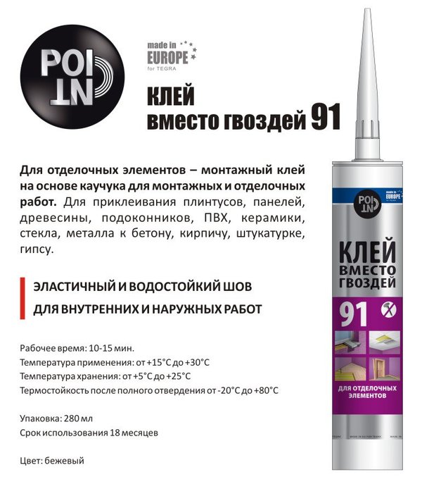 Представляем клей вместо гвоздей 98 POINT: • Клеит большинство строительных материалов: керамику, гипсокартон, фанеру, металл, пластик, ОСБ плиту, стекло, древесину, кирпич, бетон, штукатурку, камень; • Удобно пользоваться в быту: не нужно сверлить, нанесли клей, прижали и всё; • После 48 часов клей уже выдерживает особо большие нагрузки. Очень удобно клеить плинтус, наличники дверей. Высокая сила схватывания – отлично прилегает ко всем неровностям стены. Походит для всех сезонов, температура применения от +30˚С до -20˚С.